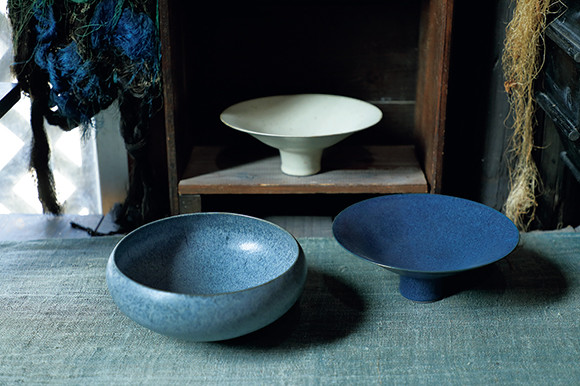 シンプルな大皿は使い勝手もよい。薄いブルーのお椀¥3,800、アイボリーと藍色の皿各¥2,800