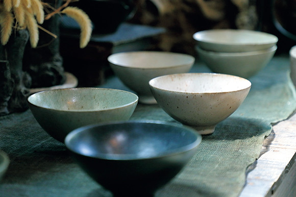 大和村の古民家で美しいうつわを作り続ける陶芸家・森雅志。「流木の質感を出したい」と厚さ1㎜を目指したうつわは、薄さと軽さ、手に寄り添うなめらかな質感に驚く。海の濃淡のような藍色やエメラルドグリーン、茜空を思わせる薄いピンク、アイボリーなど、ニュアンスある色は奄美の自然に着想を得たもの。釉薬にこだわって研究を重ねているため同じ色はひとつとしてなく、あれもこれもとほしくなってしまう。
