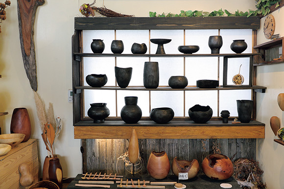 木工作品が整然と並ぶ、工房兼ショップ。奥は、椎の木をバーナーで炭にした深い黒色の花器。