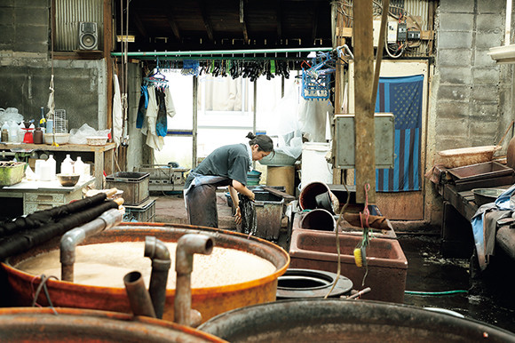 「染色は自然との繊細な化学反応」と、2代目。気温や湿度で仕上がりも大きく変わるため、熟練の技が必要とされる。