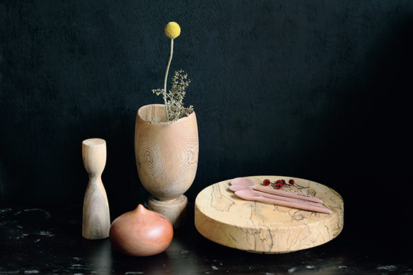 左から、ガジュマルの蝋燭スタンド¥2,000、車輪梅のペーパーウエイト¥2,000、ガジュマルの花器¥10,000、赤木のスプーン各¥2,000、スポルテッドが美しいエゴノキのコンポート皿¥20,000
