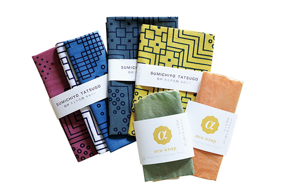 大島紬の代表的なスミ千代柄をデザインした手ぬぐい 各¥2,200~、淡い草木染めの蜜蝋ラップ 各¥1,320~