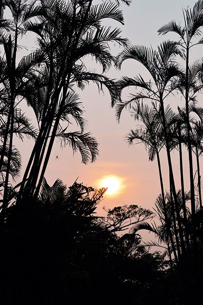 椰子の木の後ろに沈みゆく夕日が幻想的。