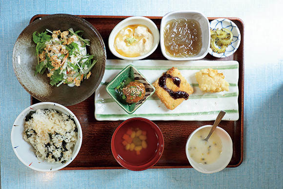 祖父が始めた豆腐店を継いで、3代目が食堂にリニューアル。透明度20m以上の奄美の海水のミネラル豊富なにがりと厳選した国産大豆で作られた島豆腐は、ほのかに甘く、クリアな味わいに驚かされる。家族に伝わる豆腐料理のレシピは、なんとノート4冊分。ピーナッツ豆腐の天ぷらやおからコロッケなど、ユニークな豆腐料理を含む約10品の週替わり定食に、湯豆腐や豆乳も食べ放題というコスパのよさで、昼時には常に満席になってしまう人気店だ。