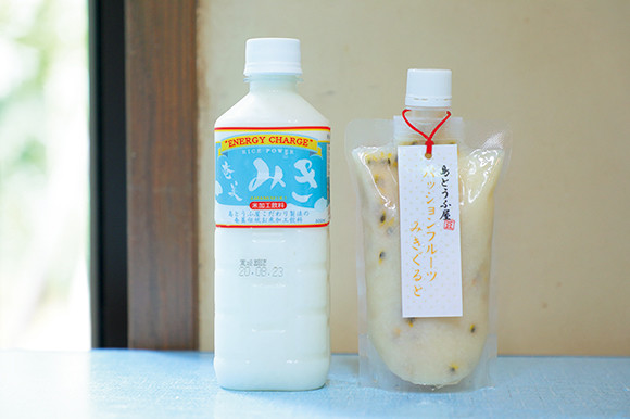 豆腐や総菜、伝統的な米の発酵飲料みきを販売。左から、甘さ控えめ「みき」500㎖ ¥170、この夏登場したデザート感覚の「パッションフルーツみきぐると」200㎖ ¥300
