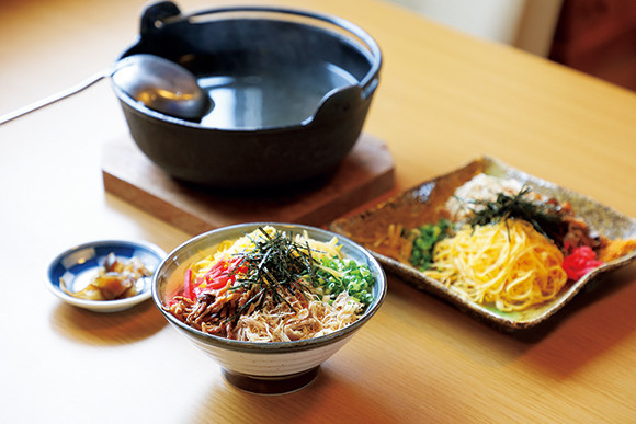 江戸時代に薩摩の役人をもてなすためのものだった郷土料理の鶏飯。約30年前、大島紬の職人だった先代が養鶏場からスタートして始めたこの店は、朝から晩まで地元の人たちが訪れる。放し飼いの地鶏を4時間ほど煮出した、あっさりとした味わいながらコクのある特製スープが自慢だ。細かく裂いた鶏肉、錦糸卵、シイタケ、ネギ、ノリ、紅ショウガなどの具をご飯の上にのせて、スープをたっぷりとかけて。無農薬のタンカンの干皮が爽やかなアクセント。