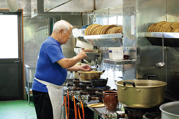 「のびのびと育った鶏から出汁がしっかりととれるから、ほかの調味料は少しでいい」と、先代。養鶏場のほか、タンカンやパパイヤも自家栽培だ。