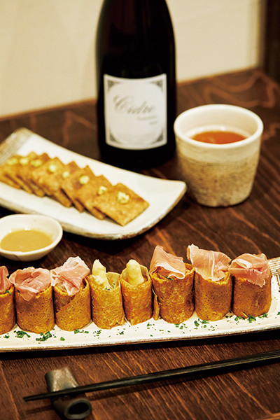 パリ、ブルターニュ、東京と3都市のガレット専門店で活躍し、さらに、通に愛される神田の眠庵でそばを学んだ玉越幸雄オーナーシェフ。フランスで学んだ“自国愛”をここ浅草から伝えたい、とガレットと国産シードルの店を立ち上げた。信楽焼のうつわにのったガレットは、毎朝石臼で挽いたそば粉を使用するため、鼻から抜けるそばの香りがたまらない。おつまみからデザートまで多種多様なガレットは、約30種揃うシードルと合わせてどうぞ。