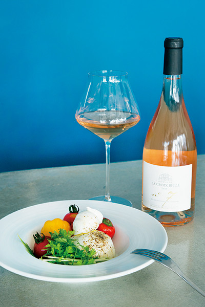 手前は、北海道産チーズを使用した「ブッラータチーズ ギリシャ産オリーブオイル」¥2,473、奥は女性醸造家による「ラ・クロワ・ベル」グラス¥1,509