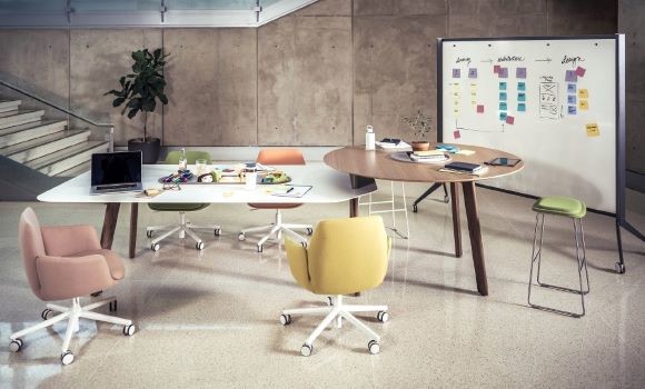 数人でデスクをシェアするなら。テーブル「Immerse」と肘掛け椅子「Poppy」はいずれもパトリシア・ウルキオラのデザイン。photo:Haworth