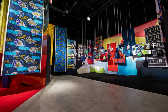 バッグ、ふろしき、オリジナルテキスタイル。会場の最後まで心弾む構成に。