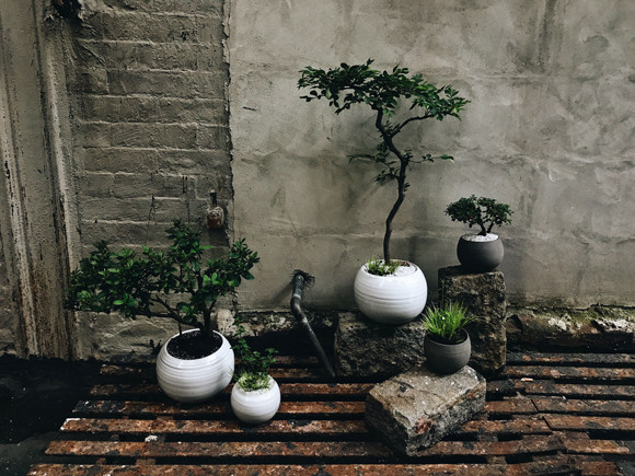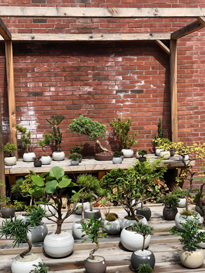 ダンディ・ファーマーの屋外に揃う、モダンな盆栽の数々。お店で販売する盆栽はオーナーが3ヵ月から数年かけて育てたもの。photo:Dandy Farmer