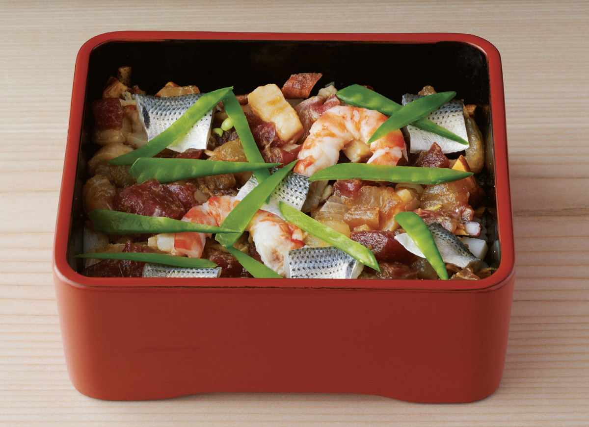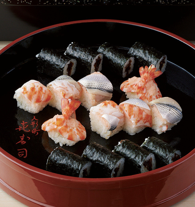 料亭が立ち並び、花柳界も華やかな時代には、お座敷への出前の「盛り込み」も、技巧をこらした手綱巻きなどを入れて見た目が美しくなるよう工夫した。江戸前の仕事が施されたさまざまな鮨が、ひとつの作品のように凝縮される。