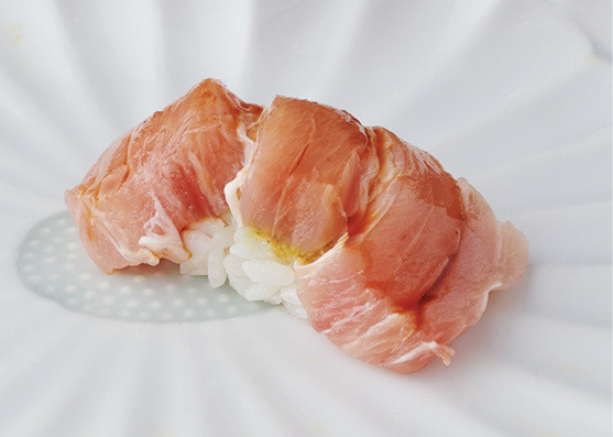 赤身ながら、中トロのような華やかな味わいもある血合いギシ。香りとその余韻が豊かに広がる。