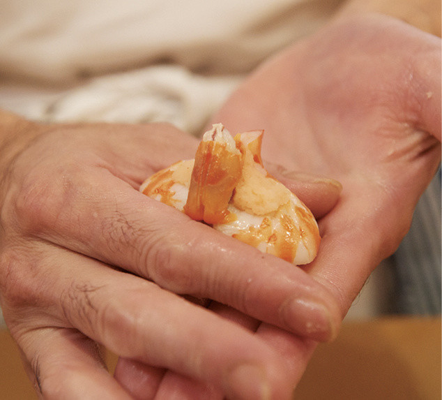 「他にも、才巻海老とおぼろを握る『唐子づけ』に、煮イカに鮨飯を詰めた『イカの印籠詰め』、車海老とコハダの『手綱巻き』など、食材に”ひと仕事”を加えたものをうちでは出します。それが、いわゆる江戸前鮨の代表例といえるのではないでしょうか」