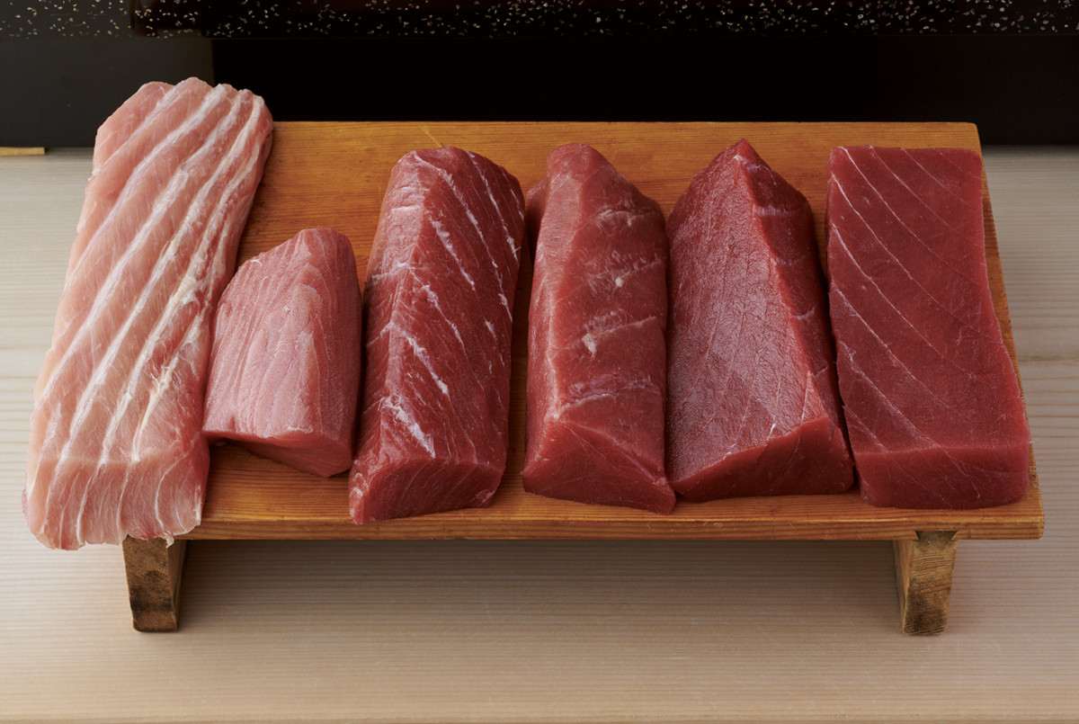 青森県の三厩であがった177㎏の本マグロ。左からマカジキ、ヒレの中トロ、血合いギシ、ヒレ下、天端、赤身の真ん中。