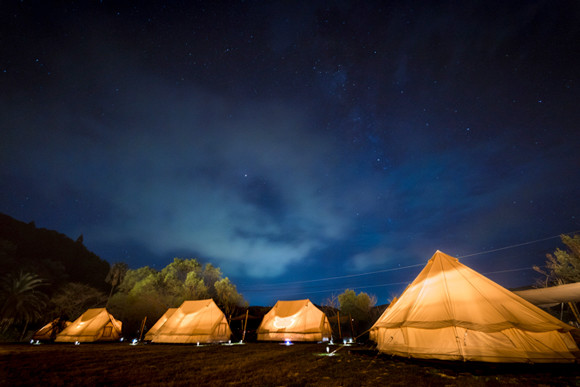 満点の星空に包まれる、学校の広い校庭を利用したグランピング施設では、ノルディスクのテントに宿泊が可能。