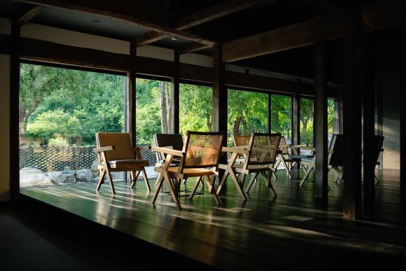 貸し切りの滞在だから、静かな時間が流れる。木曽の木工職人が作ったチェアも美しい佇まい。