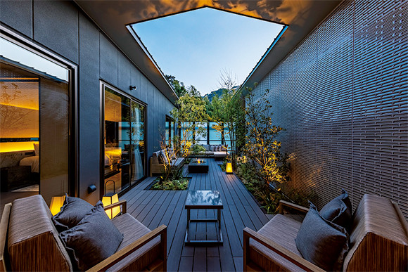 2007年、熱海から始動した高級温泉リゾートのふふが、ブランドの粋を極めた別邸「木の間の月」をオープン。全6室すべてに約30種類の木々や四季の草花が茂るプライベートガーデンテラスを設置。自家源泉の露天風呂やデイベッドを備え、月明かりや川のせせらぎが堪能できる造りに。バーコーナーを設置した客室では、月をイメージした照明やアートを配し、日本の美意識も表現。