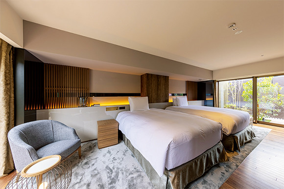 客室のベッドはシモンズと共同開発したマットレスを使用。館内には鮨割烹もある。