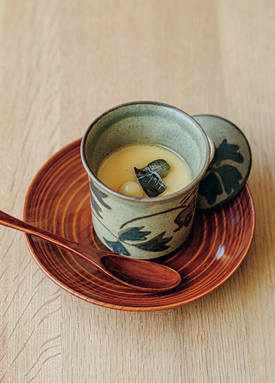 奥飛騨温泉の温泉水で養殖したスッポンを茶碗蒸しに。歯ごたえのあるゼラチン質のエンペラとウチコ、卵と、異なる食感が楽しい一品。お碗は隣花苑から引き継いだ、大正10年頃の「華蔓草小吸物碗」
