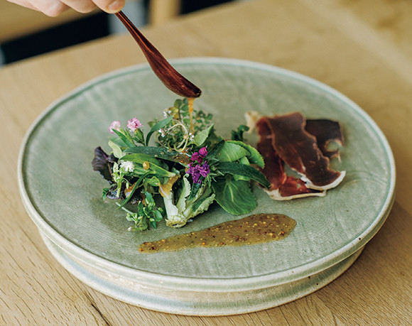 「ドレッシング不要なほど味が濃い」という野村農園の野草や野菜を、シカの生ハムとともにいただく。生ハムは明宝ジビエのシカの脚を施設内で熟成させた自家製だ。