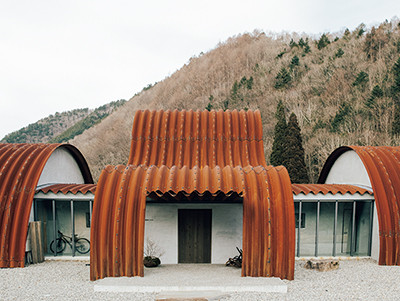 豪雪地帯の自然に耐えられるよう、Rにデザインされたコルゲート銅板の屋根が特徴的。建築家の遠藤秀平が設計したもので、屋根の赤さびは時を経てレザーのような質感に変化する。