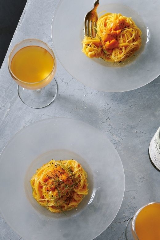 旬のウニの冷製パスタに、オレンジワインをあわせて。