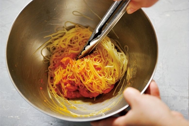 夏に旬を迎えるウニを麺料理に使うなら、涼しげな冷製スパゲッティをお薦めしたい。調味料は、シンプルにオリーブオイルと塩だけ。とろりとした卵黄が、ウニの風味をリッチかつクリーミーにまとめあげてくれる。そんなウニソースとしっかりと絡むよう、スパゲッティは細めのものを選ぶといい。