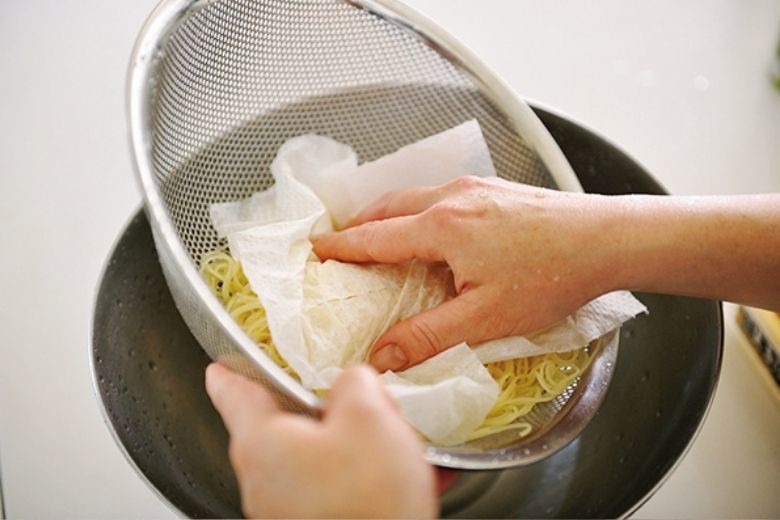 2.塩(分量外)を加えた湯で、スパゲッティをパッケージの表示通りにゆでる。ゆで上がったら冷水にとり、キッチンペーパーで水分を吸い取りながら、しぼるようにしてしっかりと水けを切る。