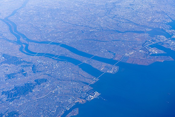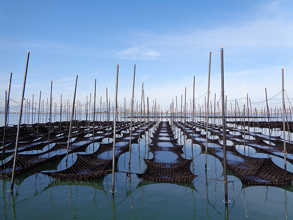 桑名にあるノリの支柱漁場。これは支柱を遠浅の海に刺し、そこに網を張って養殖を行う方法。潮の満ち引きによって、太陽の恵みを浴びる時間帯と、海の栄養を摂取する時間帯に分けられるのが特徴だ。このような支柱養殖は、現在ではわずかな地域でしか行われていない。