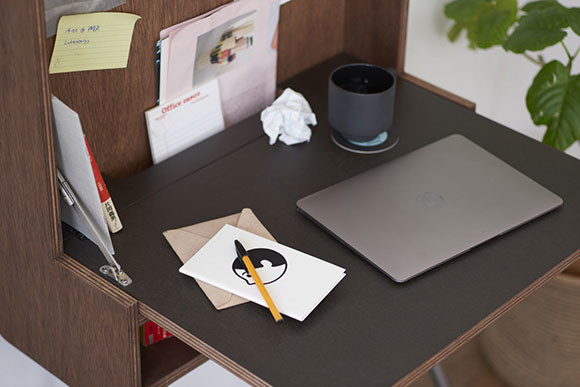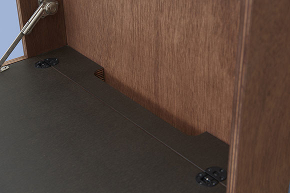 天板を跳ね上げると奥行きは26.5cm。コンパクトながら配線孔も備え、しっかりとした作業環境を確保。リビングや寝室の一角に溶け込みながらワークスペースをつくる。
