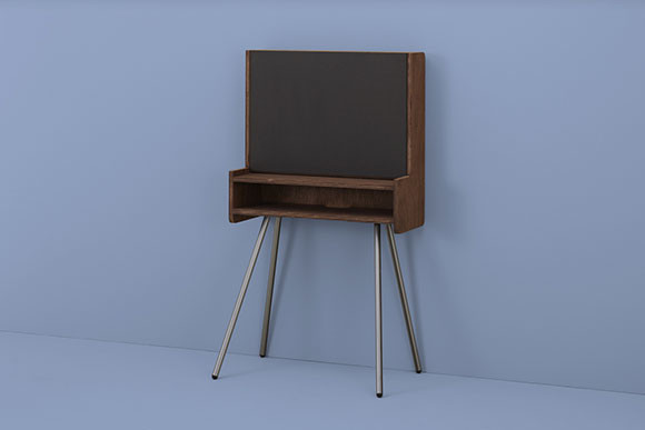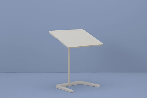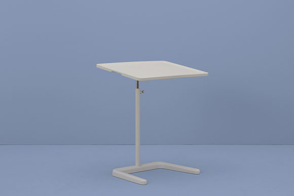 譜面台のようなフォルムのテーブルは、ジャスパー・モリソンがノートPCを置くために開発したもの。高さや傾きを調整し、ベストな角度でモニターを見ることができる。ソファやアームチェアでちょっと仕事をする際や、ビデオ会議、仕事以外でもレシピを確認しながら料理をしたり、映画を見るのにも便利そう。天板の周囲には盛り上がった縁があり、両サイドにはハンドル付きで持ち運びもしやすいよう計算されている。