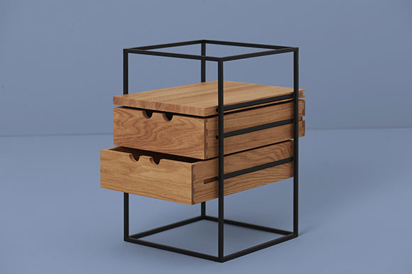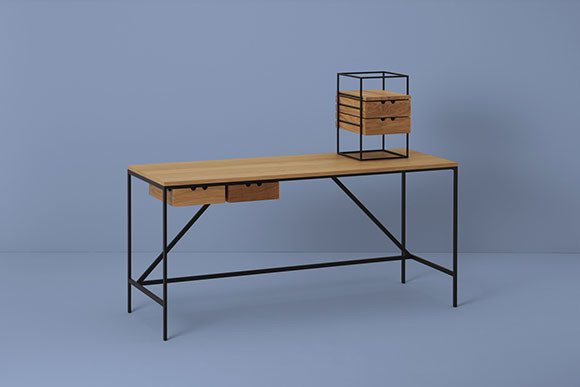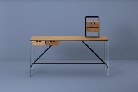 スリムで直線的なスチール製のレッグにオーク材の天板、2つの引き出しを備える。装飾を削ぎ落とすことで素材の美しさが引き立つ。