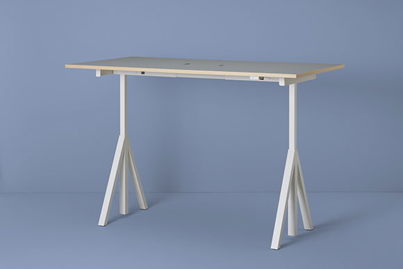 スウェーデンのストリング ファニチャーのデスクは、ボタンひとつで高さが調整できる優れもの。無段階調整なので使う人の身長や座る椅子の高さ、姿勢に合わせて細やかな微調整ができる。デスクの高さを変えて作業中に立ったり座ったりすることは、気分転換になるだけではなく健康にもよい。天板中央にはスリットがあり、ケーブルもスマートにまとめられる点も高ポイントだ。