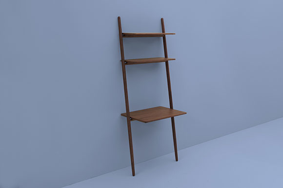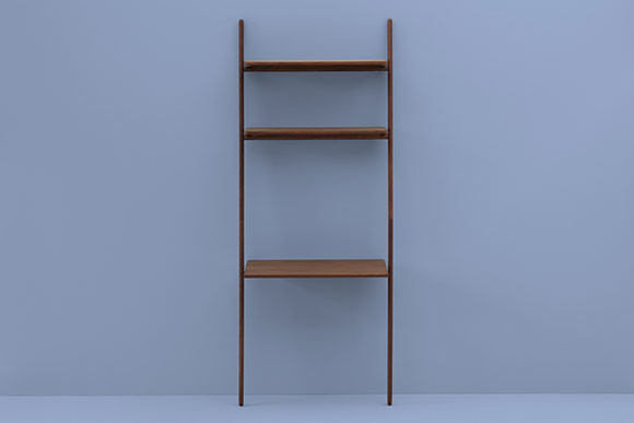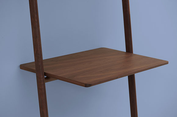 壁に立てかけて使う梯子のようなデスクはアメリカのDWR for ハーマンミラーのオリジナルプロダクトで、デンマークのノーム アーキテクツがデザインを手がけている。シンプルな立てかけ式のラダーシェルフのようだが、最下段のシェルフはデスクの天板としての使用を前提にしたもの。昔ながらの木製家具を思わせる素朴さとクラフト感が魅力だ。壁があればどこにでも置けて、手軽に動かすことができる。