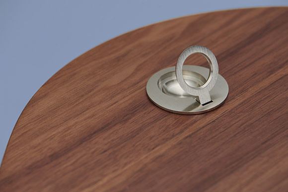 テーブル天面にある小さなハンドルは天板昇降用。天板は写真のウォールナットのほか、受注生産でチェリー、オーク、アッシュも。