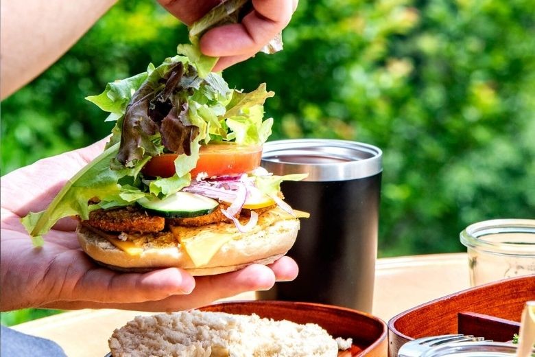 新鮮な野菜と共に、上勝町内のブルワリー「RISE & WIN Brewing Co.」から運ばれるバーガー用の食材。スープやヨーグルトなどボリューム満点の美味しい朝食。Photo: Transit General Office Inc. SATOSHI MATSUO