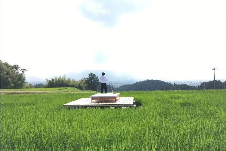 ヴィラを取り巻く田んぼの真ん中で寛ぐ。好天ならば北アルプスが望める場所。Photo: Tobira Group