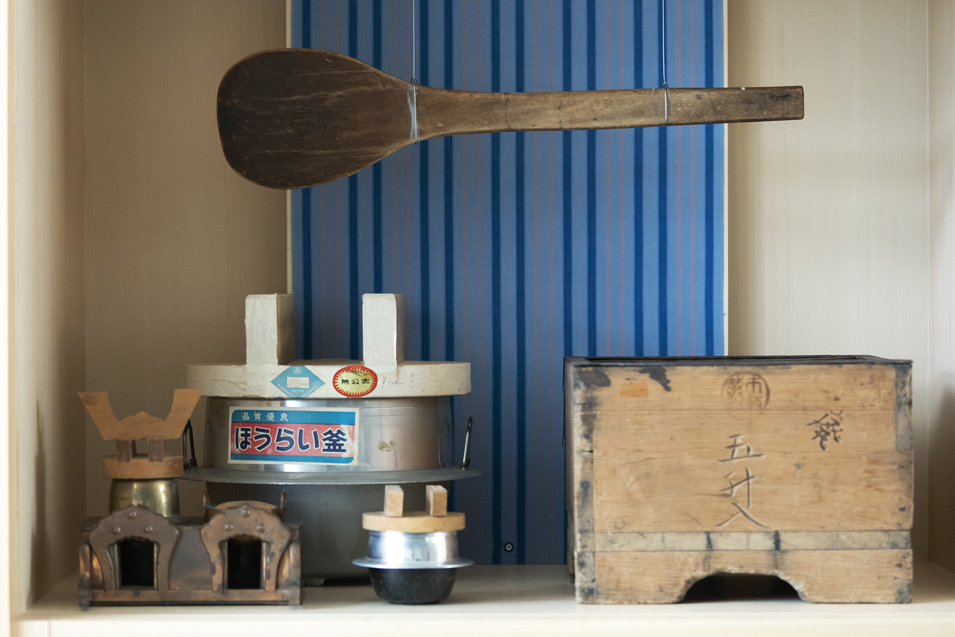 昔ながらの羽釜に乗せられる木葢には、興味深い形状のものが多々。蕪の形状を模したものには邪気を払う願いが込められているという。左手前の小さなかまどは、昭和初期の京都のミニチュア玩具、雛かまど。