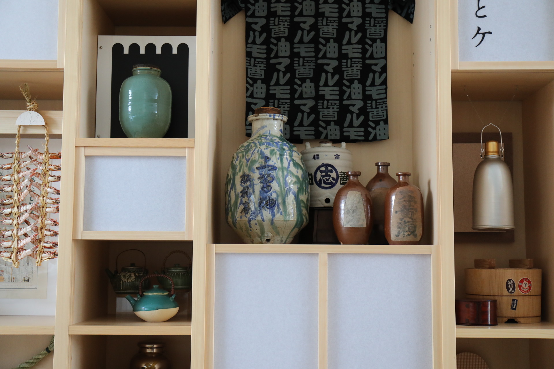中央は「醤油」のコーナー。三重県の醤油蔵や酒蔵では、古くから自社製品や家紋入りのグラフィカルな法被を着て仕込み作業を行ったそう。
