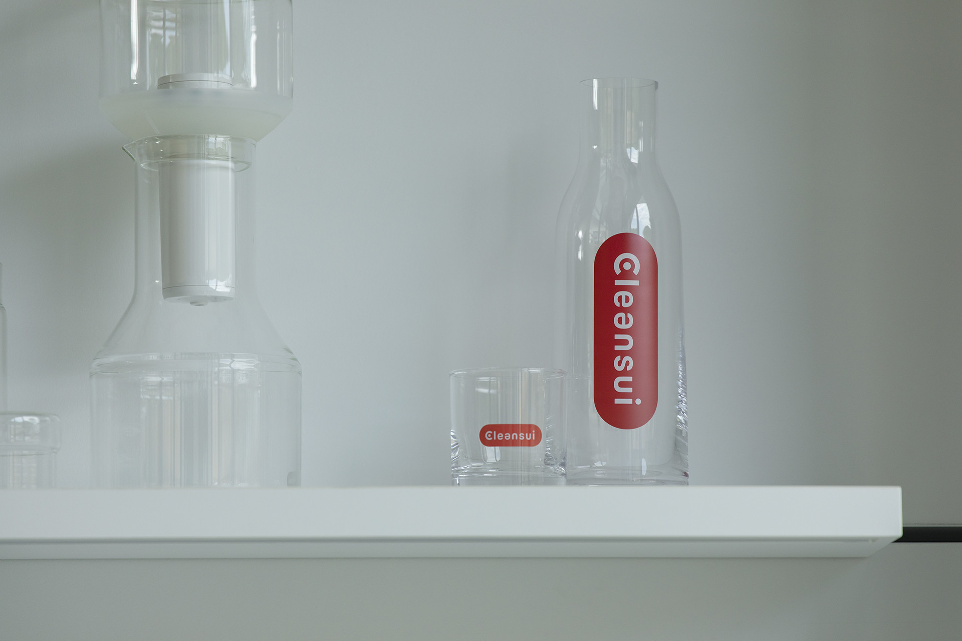 館内には浄水器やボトルなどの製品が並ぶ。クリンスイハウスのロゴはTSDOの佐藤卓が制作。