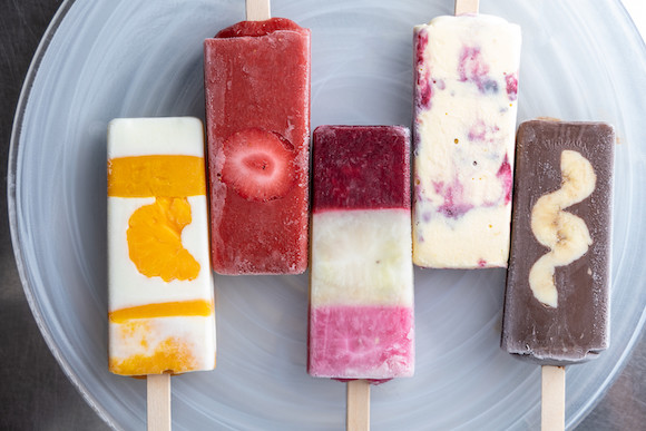 左から、ヨーグルトベースにマンゴーピューレをミックスした「マンゴーヨーグルト」、凍らせたイチゴを食べているような「ストロベリー」、カシスと赤ワインのベースにフルーツをミックスした「カシスミックス」、レモンベースにベリーソースが爽やかな「レモンベリー」、ビターチョコレートにバナナの甘さが絶妙な「バナナチョコレート」。各¥500