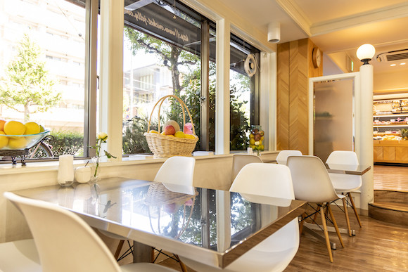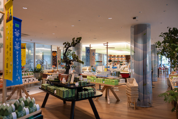 看板商品のお濃茶ラングドシャ「茶の菓」をはじめとするマールブランシュの全商品に加え、ロマンの森の限定商品を展開。奥にはゆったりとしたカフェスペースがあり、できたてのスイーツを楽しめる。