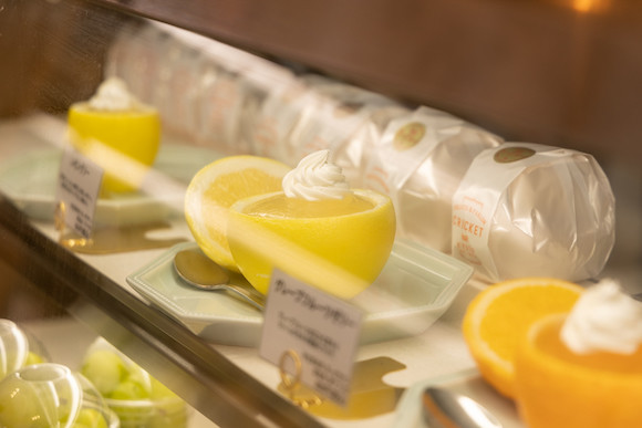 グレープフルーツ、オレンジ、レモンの皮をそのまま器に使った、プルプルの食感のゼリー。京都人のおやつや手土産に人気の看板商品。こちらもお取り寄せ可能。各¥800