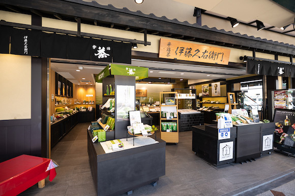 1階は宇治茶や抹茶スイーツが並ぶショップ。購入したアイスバーは、赤い毛せんが敷かれたベンチでいただける。パフェアイスバーの販売は、ほかに宇治本店、JR宇治駅前店、平等院店、京都駅前店で。
