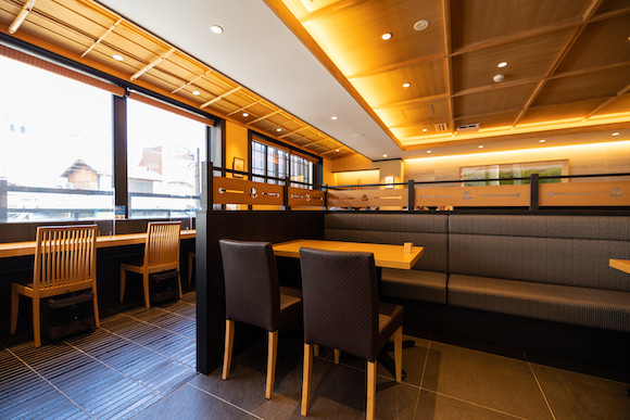 四条大和大路の南東角に立つビルの2階と3階が、祇園四条茶房のフロア。和の風情漂う落ち着いた空間。甘味のほか、抹茶そばや抹茶カレーうどんといった食事メニューも揃う。