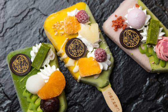 江戸後期の1832年創業という宇治茶の老舗。宇治本店の茶房ではパフェやあんみつなどの抹茶スイーツを求める人々の行列が絶えず、なにか店頭やテイクアウトで楽しんでいただけるスイーツを、と開発されたのがこの「抹茶パフェアイスバー」。2019年の夏、祇園四条店のオープンに先駆けてリリースされて以来、なんと30万本以上を販売。茶房で人気の定番や季節限定のパフェを再現しながら、アイスバーとしての完成度も極めたもの。香り高い抹茶のアイスクリームをベースに、種類で異なるカラフルなトッピングが楽しい。フォトジェニックな見た目はデザイナーが手がけ、職人が具材を手作業でのせて完成している。春のさくら、秋のモンブランなど季節限定の味が、アイスバーなら通年で楽しめるのもうれしい。