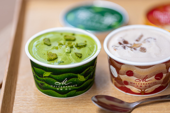 「モンブランアイスクリーム」にはマールブランシュのモンブランに欠かせない、サバトン社のマロンペーストとバーディネー社のネグリタ・ラムを使用。「茶の菓アイスクリーム」に使う茶葉は、貴重な手摘みを中心にブレンドした宇治抹茶一番茶。甘みを含んだ深い味わいが特徴。各80ml ¥378。お取り寄せの場合、各4個ずつ8個セット¥5,400(送料込)