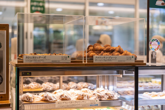 ロマンの森の特徴は、工房がガラス張りで製造風景が見渡せること。その工房から作りたてがショーケースに並ぶ新名物のひとつが「モンブランバタークロワッサン」テイクアウト¥378(テイクアウトの価格、イートインも可)